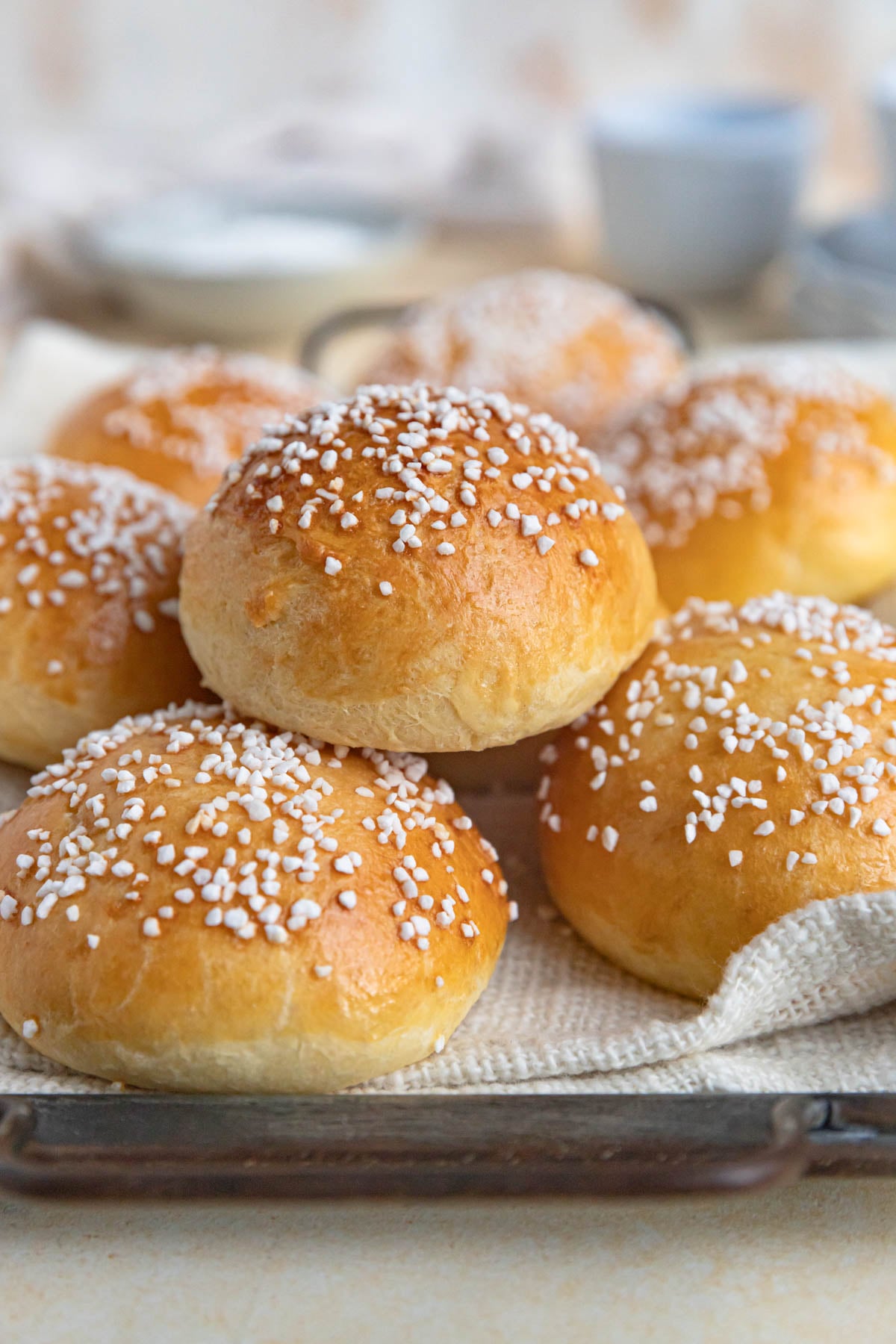 My brioche au sucre (aka sugar brioche) recipe produces buns that are soft, pillowy, and deeply buttery. They're topped with Swedish pearl sugar for a satisfying crunch and a touch of sweetness. This recipe starts with my homemade brioche dough, which is made with plenty of eggs and butter for a tender crumb and rich, indulgent flavor.