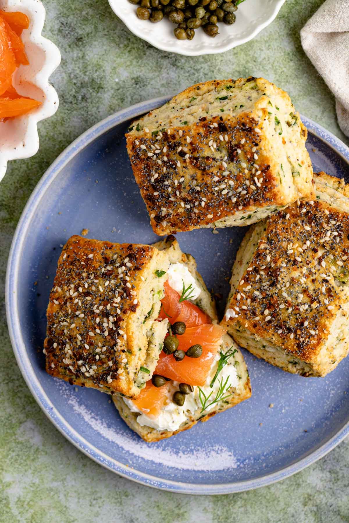 My everything bagel scone recipe is a mouthwatering combination of my buttery flaky scone recipe and my homemade everything bagel seasoning made with poppy seeds, sesame seeds, dried onions, granulated garlic and fresh green onions. A sprinkle of homemade bagel seasoning on top gives the scones a crisp, savory crust that's delicious with cream cheese or smoked salmon.