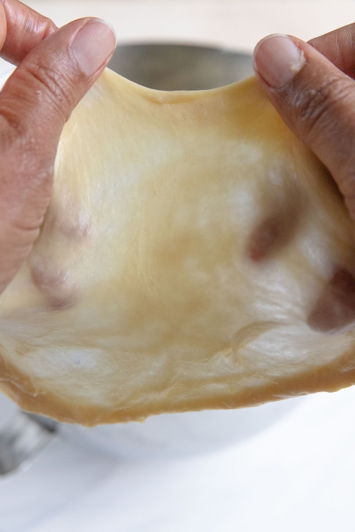 Step 9: Perform the window pane to ensure the dough is elastic enough. You should be able to see through the dough.