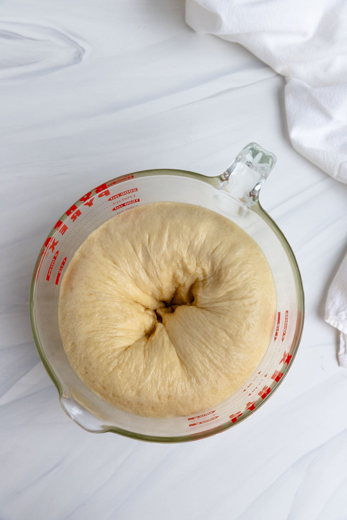 - Place the dough in a lightly greased 8-cup measuring cup. Lightly press the dough down, it should come up to the 4-cup mark on the measuring cup. Let the dough rise in a warm spot, until doubled. It should reach the 8-cup mark.
