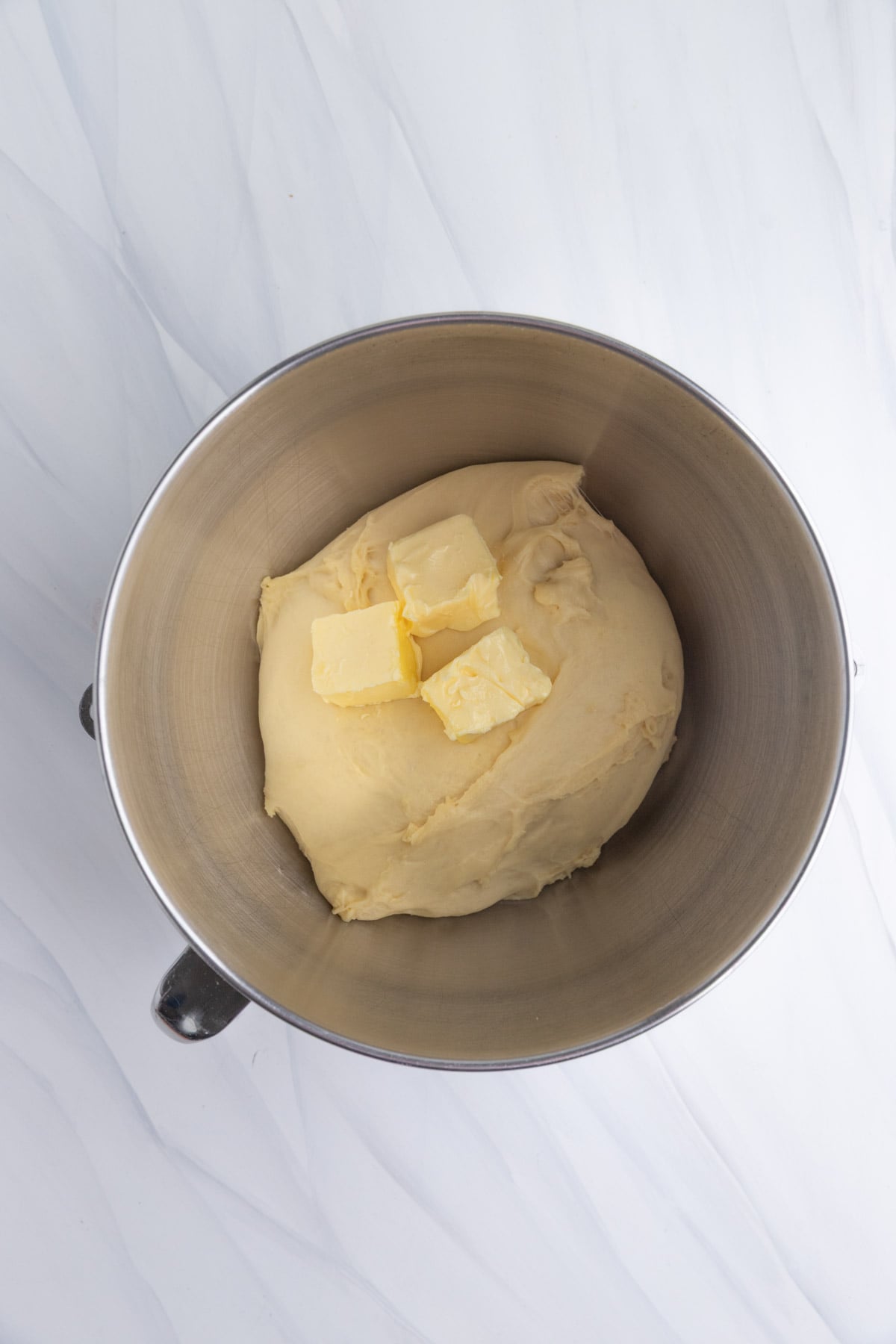 - Place the dough back into the mixing bowl. Add the 1/3 of the butter in the middle of the dough. Mix on low speed until the butter is incorporated.