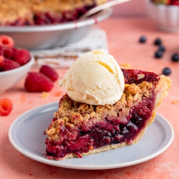I think this fruit pie tastes amazing on its own. The berries have a delicious, sweet-tart flavor, and the blueberries taste especially fruity. But this pie also tastes great with vanilla ice cream or homemade strawberry ice cream.