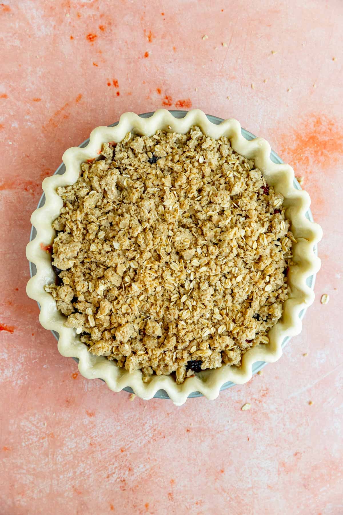 - Remove the pie dough from the refrigerator and spoon the berry into the prepared pie shell. Remove the crumble from the refrigerator and spread it evenly over the berry. Take small handfuls of crumble, lightly press together, then break into irregular chunks as you distribute evenly over the berry.