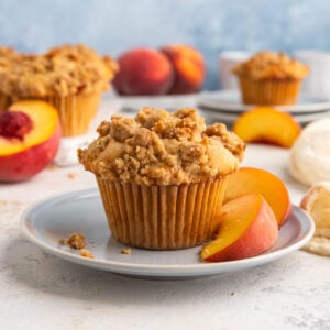 I’ve recently locked in on a muffin base that produces tender and moist muffins. Check out my banana muffins and lemon blueberry muffins for more examples of amazing muffins. Since summer means fresh peaches, and I love baking with peaches and I’ll put streusel on just about anything, making these peach streusel muffins was a no-brainer.