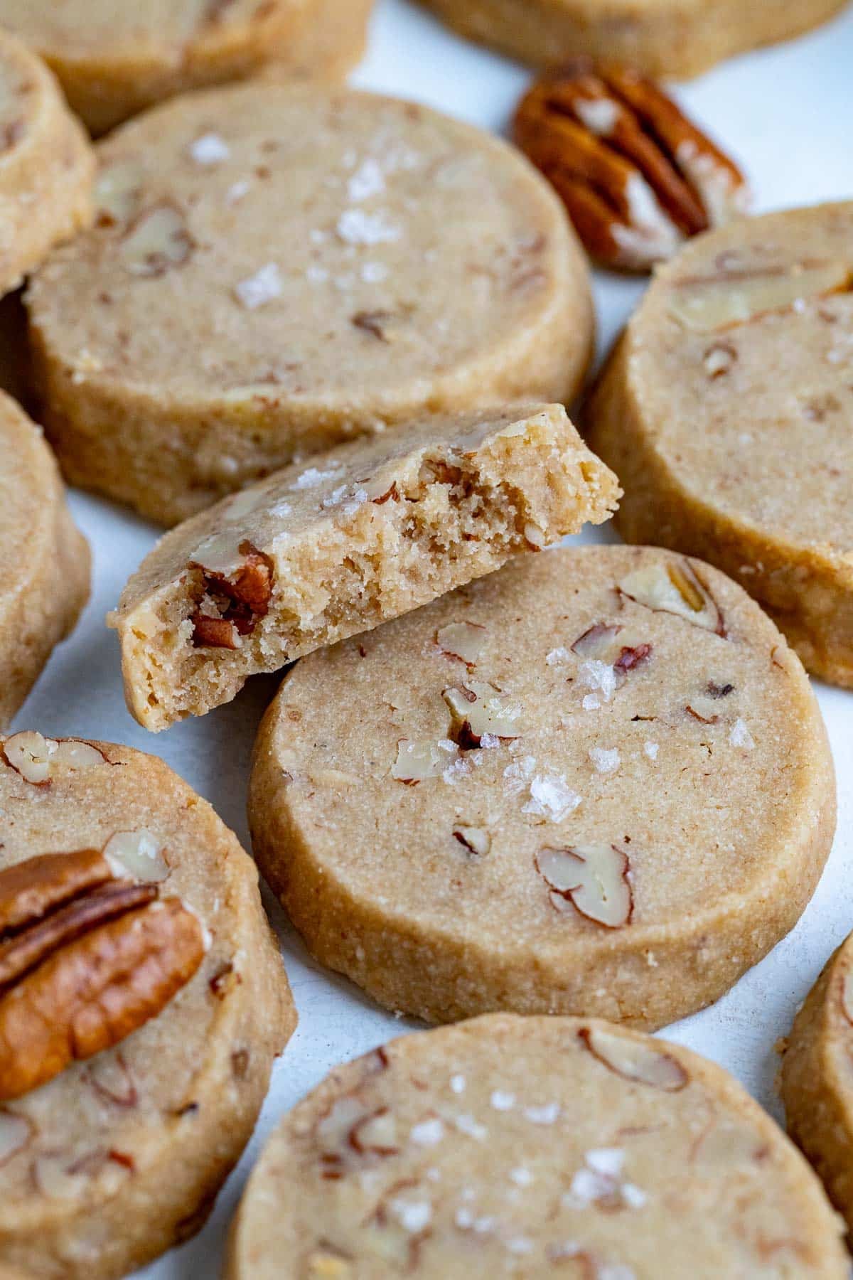 - Toasted Salted Pecans: I get these pecans from Trader Joe’s. The toasted nuts add a deep nutty flavor and the saltiness continues to build on that combination of salty and sweet. If you’re using regular untoasted pecans, toast the nuts in a 350 degree F oven for 8-10 minutes until they are lightly browned. Toasted nuts give a rich nutty flavor to the cookie.